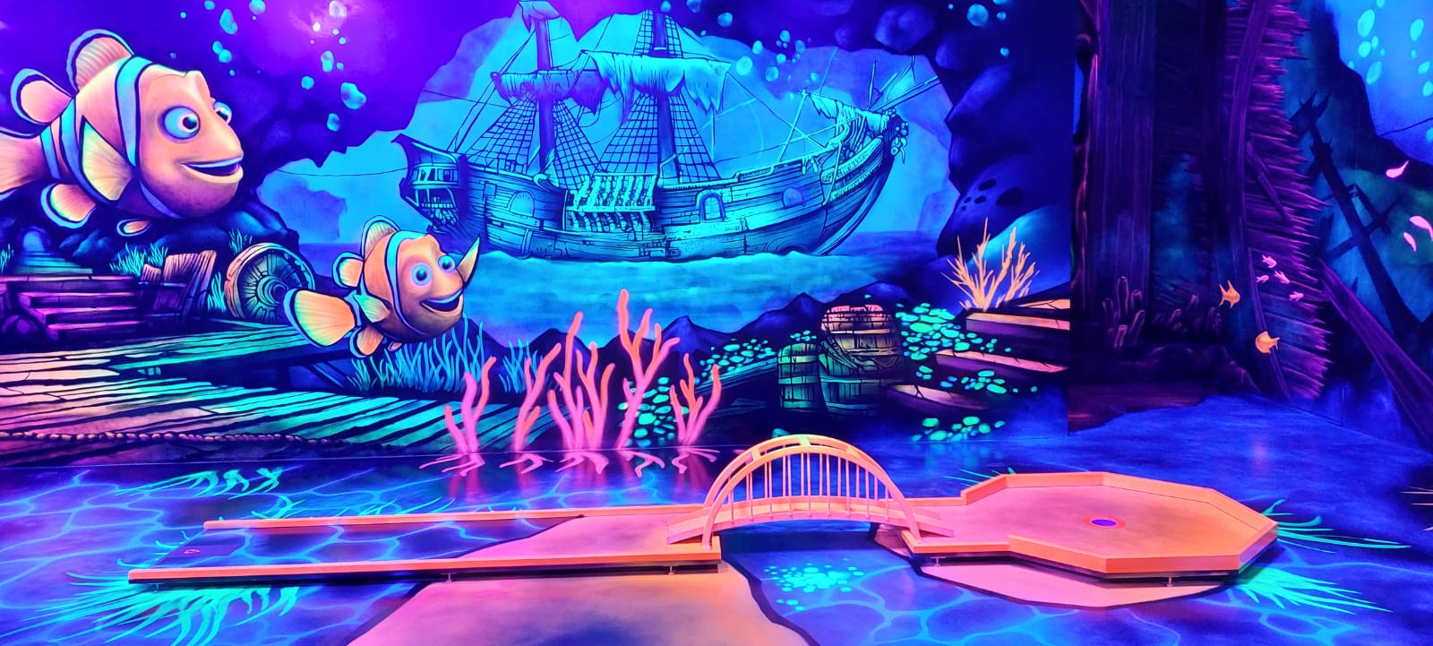 3D Schwarzlicht Minigolf bietet Freunden, Kollegen oder der ganzen Familie ein Erlebnis der besonderen Art. Unser 3D-Schwarzlicht-Indoor-Minigolf auf 18 Bahnen bedeutet Spielvergnügen und Herausforderung pur. Auf 400 Quadratmetern tretet ihr in eine ganz andere Welt ein, die aus Schwarzlicht und Soundeffekten besteht. Geht auf eine Entdeckungsreise zwischen Spiel und Realität und nehmt am besten ein paar Freunde mit.